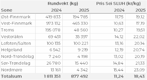 Omsetningen av fersk sei utgjorde 878 tonn til verdi 12 millioner kroner, ned fra fra 1.754 tonn og 22 millioner kroner i uke 30. Kvanta fersk sei fordelt per leveringssone fremgår av tabell 4. Størst aktivitet i Vest-Finnmark med 465 tonn, fulgt av Øst-Finnmark med 195 tonn og Lofoten med 100 tonn. Av totalen på 878 tonn var 350 tonn tatt på not, 310 tonn på snurrevad, 112 tonn på garn og 92 tonn på juksa. Det var 9 båter som leverte notsei, hvor kvantumet gikk til 3 kjøpere i Vest-Finnmark og 2 i Troms. Av 310 tonn snurrevadsei var 173 tonn levert i Øst-Finnmark, 80 tonn i Vest-Finnmark og 56 tonn i Lofoten. Større spredning i landingene av garn- og juksasei.