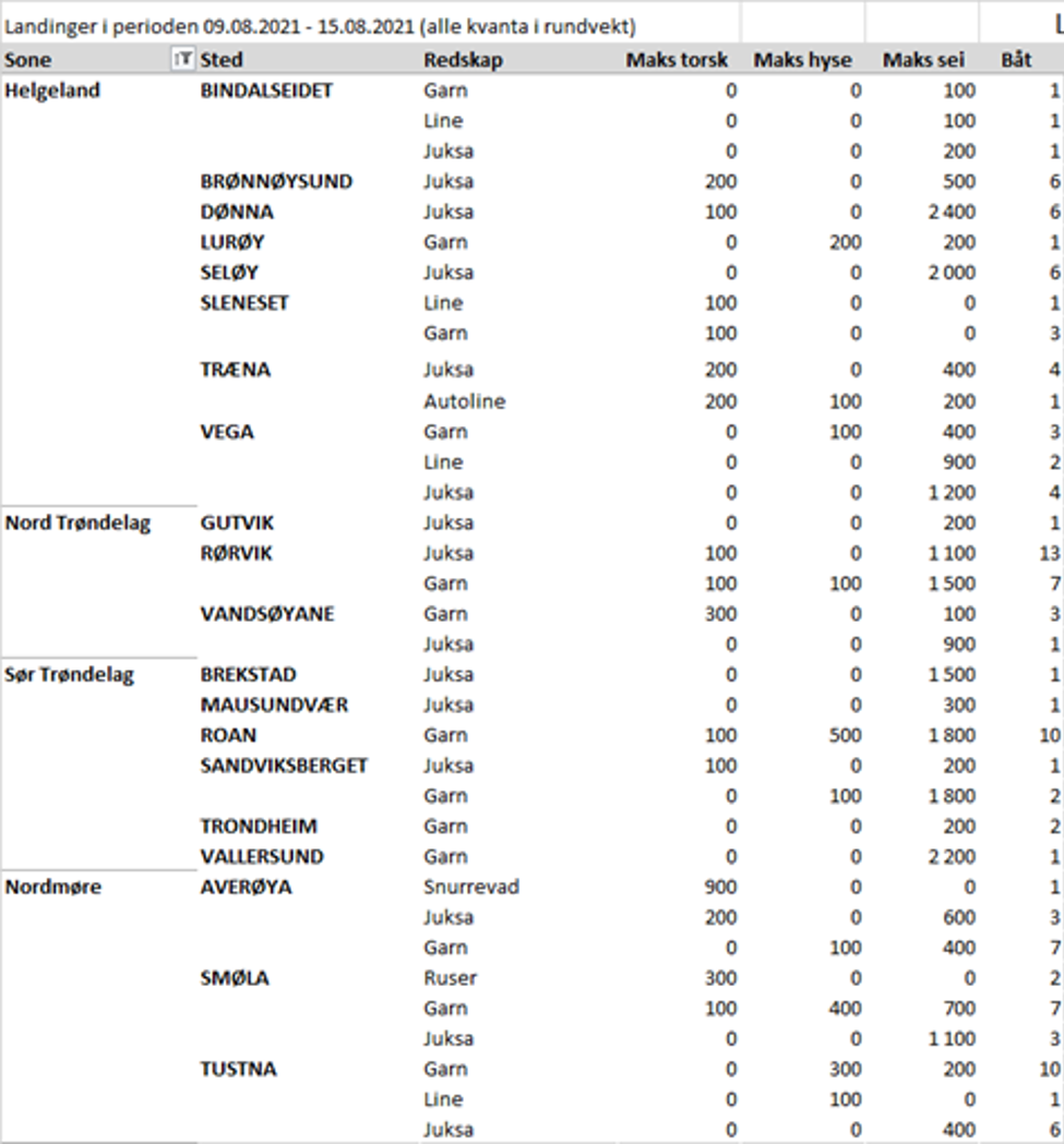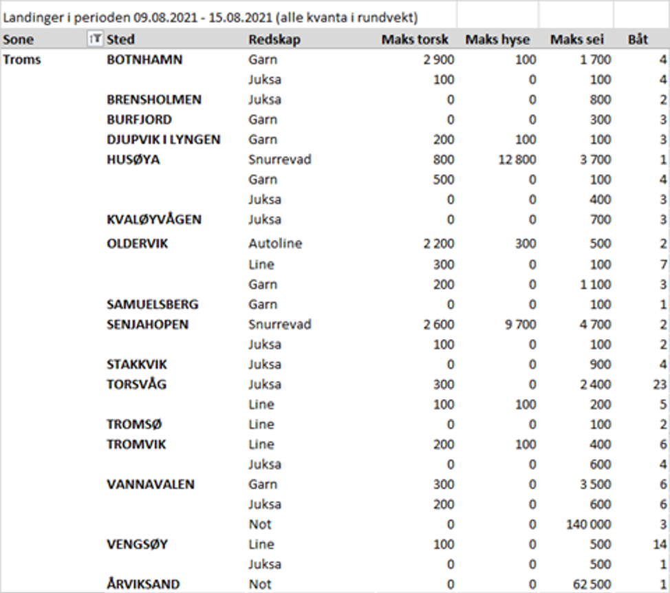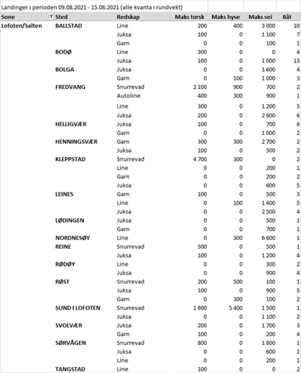 Fisket fordelt på fiskevær i Råfisklagets distrikt for uke 32 i 2021 med fokus på torsk, hyse og sei, framgår av tabellene nedenfor. Oversikten viser største enkeltfangst i rund vekt per sted for de ulike redskapene og antall båter per redskap per sted.