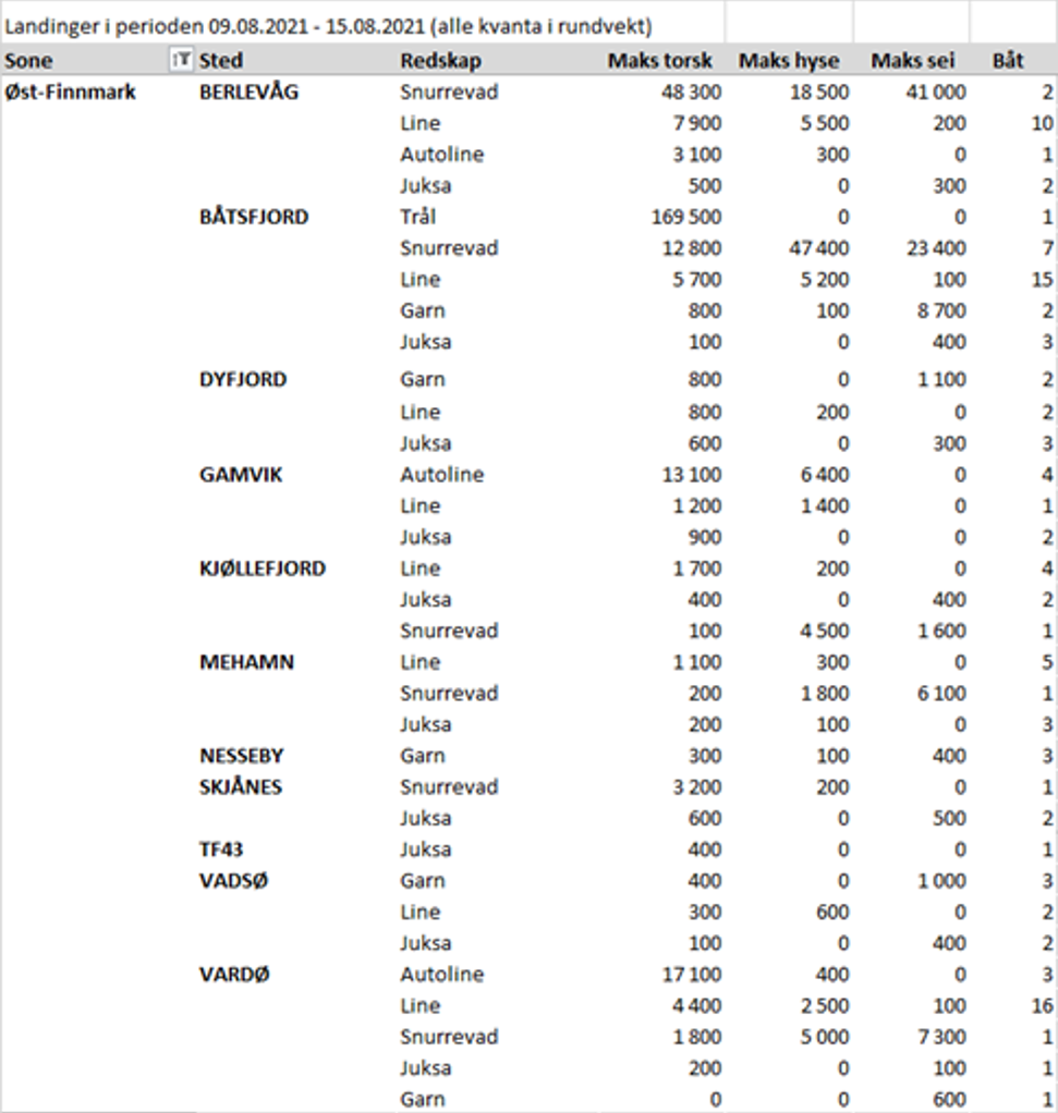 Omsetningen av ferskt råstoff i uke 32 utgjorde totalt 123,3 mill kroner, opp fra 84,6 mill kroner uka før. 37 mill kroner kom etter leveranser i Øst-Finnmark, 25 mill kroner i Vest-Finnmark. Det meste av verdiene i Øst-Finnmark kommer fra kongekrabbe og torsk som står for hhv. 18 og 11 mill kroner. For Vest-Finnmark er det seien som dominerer og står for 10 mill av totalen, etterfulgt av kongekrabbe med 7 mill kroner. Lengre sør i Troms, Vesterålen, Lofoten, er det Blåkveite på topp som står for hhv. 11, 12 og 7 mill kroner. På Helgeland er det taskekrabben som dominerer, i Trøndelag leppefisk og breiflabb på Nordmøre.