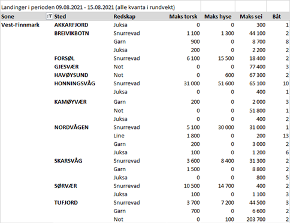 Omsetningen av fersk sei i uke 32 utgjorde 3.085 tonn til verdi av 19 mill kroner. Dette er en nedgang fra uke 31 da omsetningen var på 3.400 tonn/20 mill kroner. 1.327 tonn av totalen er tatt med not, hvorav 938 tonn er levert til 4 kjøpere i Vest-Finnmark og 388 tonn er levert til 2 kjøpere i Troms. Kvantumet var levert av 9 seinotbåter med fangster fra Sleppen/ Kamøyfjorden og utenfor Gjesvær/Nordkapp, Sørøya og Fugløya. 958 tonn av totalen er tatt på snurrevad, hvorav 643 tonn i Vest-Finnmark og 246 tonn i Øst-Finnmark. Videre er 440 tonn av totalen tatt på garn hvorav 146 tonn i Vest-Finnmark, 138 tonn i Vesterålen, 55 tonn i Øst-Finnmark og 36 tonn i Troms. 308 tonn er tatt på juksa, der 94 tonn er tatt i Vesterålen og 79 tonn i Lofoten.