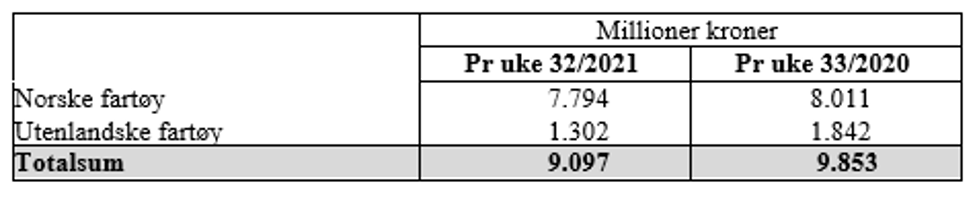 Råfisklagets totalomsetning pr uke 32 i år er på 9,01 milliarder kroner, mot 9,8 milliarder kroner til samme tid i fjor. Utenlandske fangster er ned 540 millioner kroner. For norske båter er det en reduksjon på 216 millioner kroner. Her er fryst råstoff på pluss-siden, opp 566 mill kroner og utgjør 3.190 mill kroner. For fersklevert råstoff er reduksjonen på 785 mill kroner, totalt utgjør fersklevert råstoff 4.597 mill kroner så langt i år.