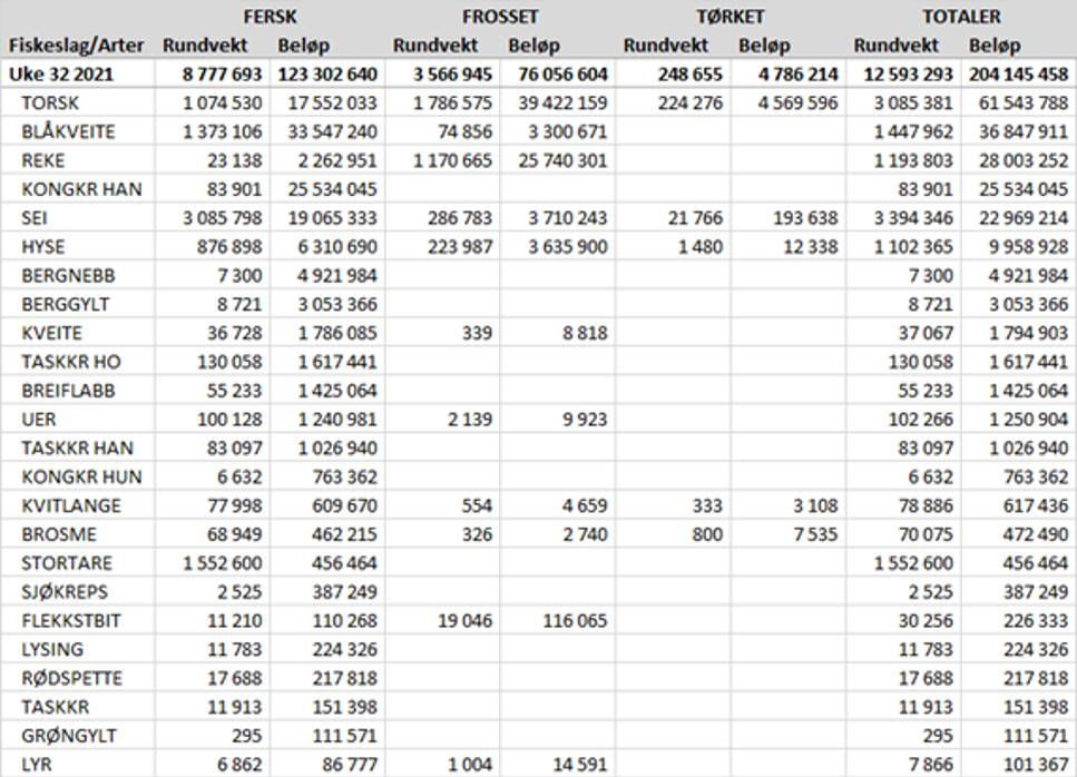Omsetningen i uke 32 nådde 205 mill kroner, opp fra 115 mill kroner uka før. Av totalen i uke 32 kom 0,3 millioner fra en estlandsk reketråler. Omsetningen for norske båter var 204 mill kroner, fordelt med 123 på fersk, 76 på fryst og 5 på tørket råstoff.