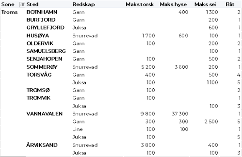 Tabell 2 og 3 viser fordelingen av landingene av fersk torsk per leveringssone og redskap (unntatt trål), med tilhørende snittpriser. De to tabellene er basert på omsetning av kvalitet A og ekstra, der alle leveringstilstander inngår, men der snittprisene er omregnet til sløyd uten hode-priser, eksklusivt restråstoff.