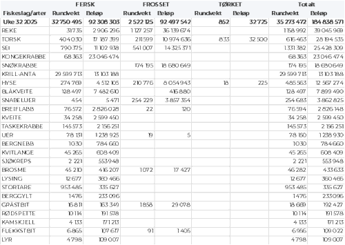 Foreløpige tall for omsetningen av fryst råstoff fra norske båter i uke 32 viser 92 millioner, opp fra 44 millioner kroner uka før. Størst verdi i uke 32 kom fra reke, snøkrabbe, sei, torsk, hyse og snabeluer med henholdsvis 36, 19, 14, 10, 8 og 4 millioner kroner. Hovedandelen av verdien på 61 millioner kom fra 13 trålere som har fisket reker, sei, snabeluer og torsk.