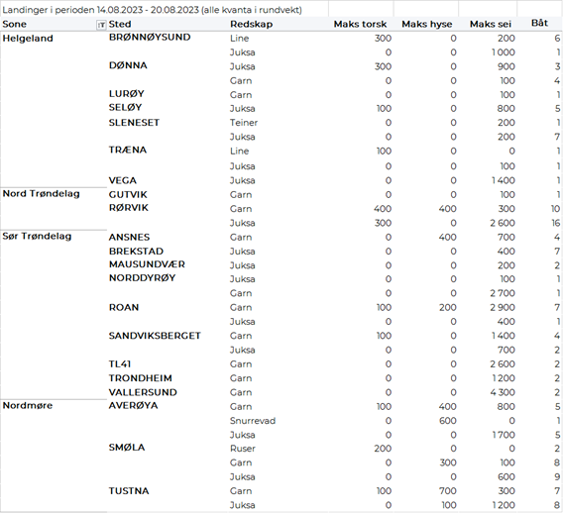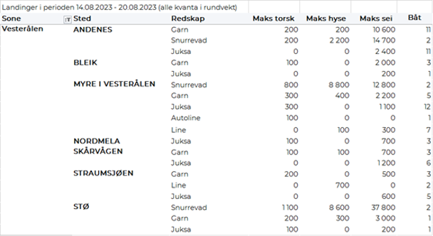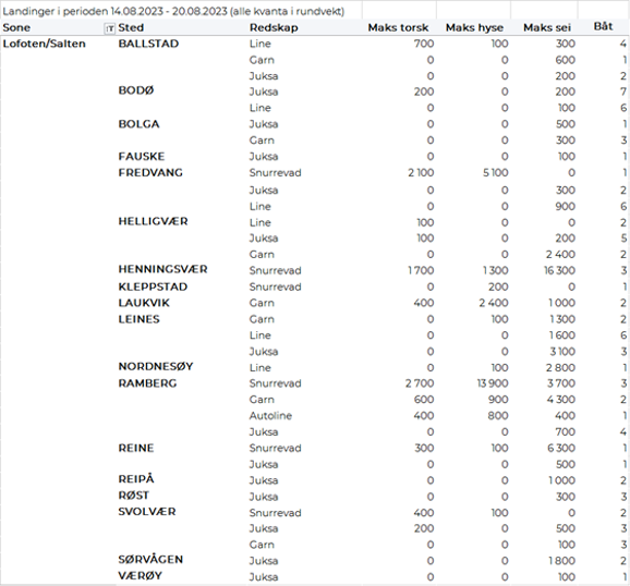 Andre periode for direktefisket etter blåkveite for båter under 28 meter største lengde som drifter med konvensjonelle redskaper åpnet 07.08.2023 og ble stengt 16.08.2023. En oppsummering av fisket viser at det i løpet av uke 32 og 33 ble det av 292 båter levert totalt 2.938 tonn til en verdi av 113 millioner kroner i Råfisklagets distrikt. Tall fra Fiskeridirektoratet viser at total fangst for begge periodene ble på 7.874 tonn slik at fangst av blåkveite hittil i år viser et overfiske på 393 tonn fra totalkvoten på 7.481 tonn. 1.551 tonn av totalen i andre periode er tatt på garn, 1.072 tonn på line/autoline og 267 tonn på snurrevad. Størst kvantum levert i Troms med 1.134 tonn, fulgt av Vesterålen med 776 tonn, Lofoten med 729 tonn og Finnmark med 244 tonn. Prismessig har det også i andre periode vært stor variasjon, fra 34+ til enkelte fangster solgt for 47 kr/kg. Gjennomsnittsprisen ble imidlertid lavere enn første periode og ligger på 38,73 kr/kg. En nedgang fra 46,79 kr/kg som var gjennomsnittsprisen i første periode. Priser er beregnet fra blåkveite levert i tilstand rund (94 % av totalen i begge perioder).