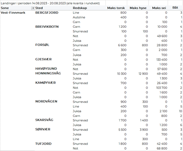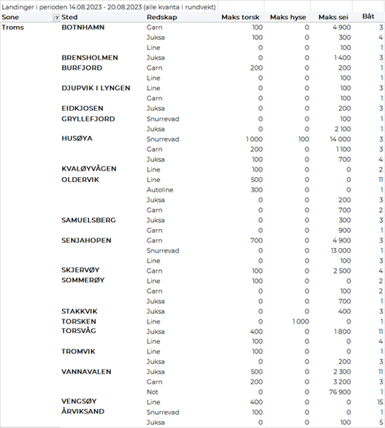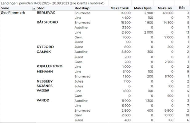 Omsetningen av fersk torsk i uke 33 var på 509 tonn til verdi 13,5 millioner kroner, en reduksjon fra 752 tonn til verdi 21 millioner kroner uken før. Høyest kvantum levert i Øst-Finnmark med 368 tonn av totalen, hvorav 178 tonn kom fra snurrevad og 163 tonn fra line/autoline. Deretter fulgte Vest-Finnmark med 78 tonn av totalen, hvorav snurrevad stod for 66 tonn. Kvanta under 26 tonn i resterende soner.