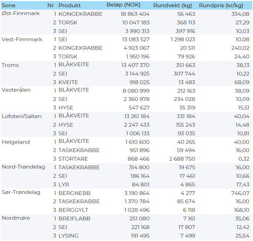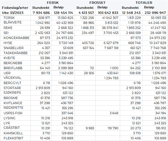 Omsetningen av ferskt råstoff i uke 33 ble på 128 millioner kroner mot 49 millioner uken før. Blåkveite var størst i verdi med 40 millioner av totalen, deretter følger sei med 25 millioner, kongekrabbe med 25 millioner og torsk med 14 millioner. Verdien av øvrige arter fremgår av tabell 2.
