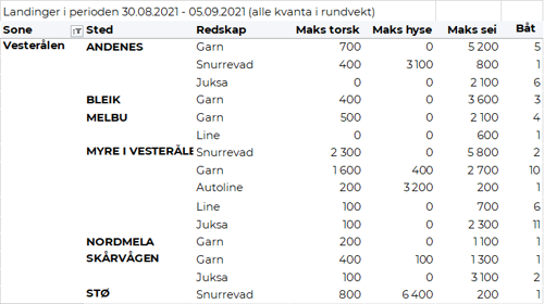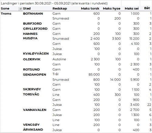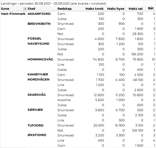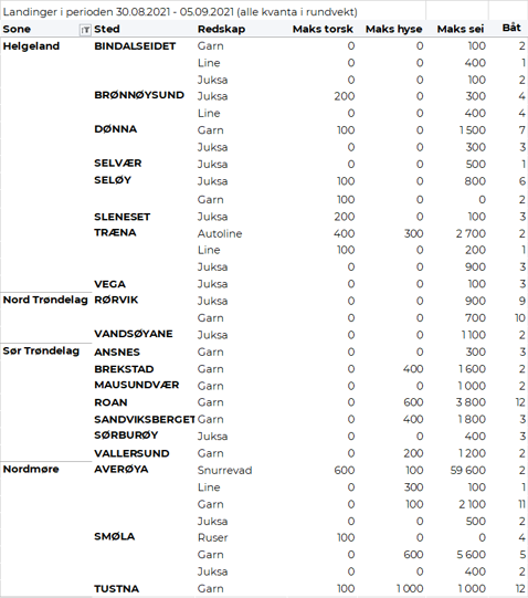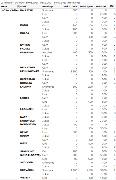 Fisket fordelt på fiskevær i Råfisklagets distrikt for uke 35 i 2021 med fokus på torsk, hyse og sei, framgår av tabellene nedenfor. Oversikten viser største enkeltfangst i rund vekt per sted for de ulike redskapene og antall båter per redskap per sted.