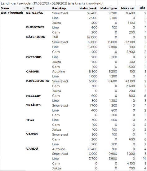 Omsetningen av ferskt råstoff i uke 35 utgjorde totalt 67 mill kroner, ned fra 88 mill kroner uka før. 23 og 17 mill kroner kom etter leveranser i henholdsvis Øst- og Vest-Finnmark. Kongekrabbe og torsk er fortsatt de mest betydningsfulle artene målt i omsetningsverdi i Øst-Finnmark og står for hhv. 8 og 10 mill kroner av totalen. I Vest-Finnmark var seien og kongekrabben størst i verdi med 5,3 mill kroner på hver, med torsken som en god nr 3 med nær 5 mill kroner.
