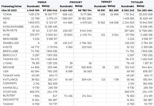 Omsetningen i uke 35 ble på 134 mill kroner, ned fra 233 mill kroner uka før da nær 90 mill kroner gjaldt ombordfryste reker. Av totalen i uke 35 kom 0,2 millioner fra en estlandsk ferskreketråler. Omsetningen for norske båter var 134 mill kroner, fordelt med 67 på fersk, 67 på fryst og 0,2 mill kroner gjaldt sjøltilvirka tørrfisk.