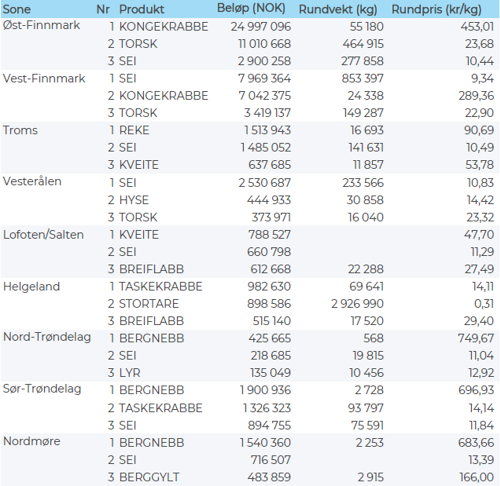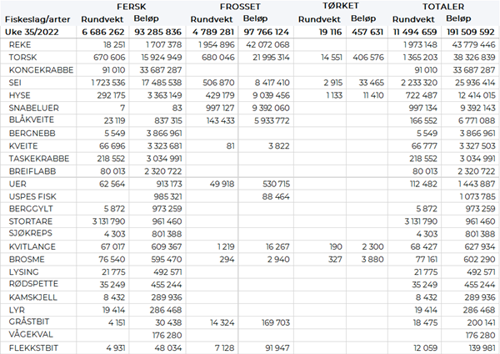 Omsetningen av ferskt råstoff i uke 35 utgjorde 93 millioner kroner, ned fra 115 millioner kroner uka før. 91 tonn kongekrabbe var størst i verdi med nær 34 millioner kroner. Deretter fulgte 1.720 tonn sei til verdi 17 millioner kroner, og 670 tonn torsk til 16 millioner kroner og for øvrig slik det framgår av tabell 2.
