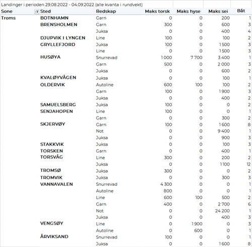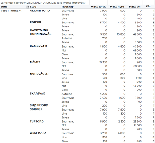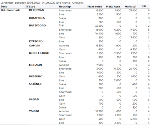 Omsetningen av fersk torsk utgjorde 670 tonn, ned fra 750 tonn uken før. 470 tonn av totalen er levert i Øst-Finnmark der trål stod for 210 tonn, line/autoline for 140 tonn og snurrevad for 100 tonn. I Vest-Finnmark var det levert 150 tonn, hvorav 140 tonn fra snurrevad. Kvanta under 25 tonn resterende soner.