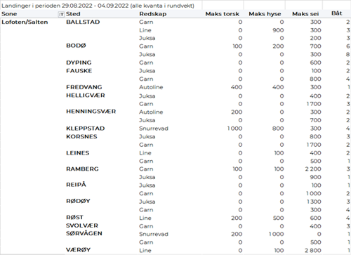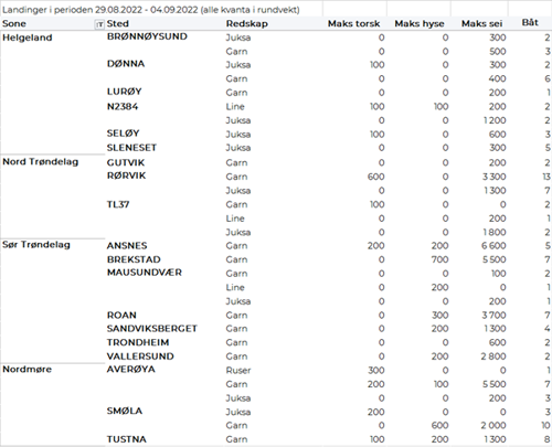 Omsetningen av fersk sei i uke 35 utgjorde 1.723 tonn/17,4 millioner kroner, mot 2.381 tonn/24 millioner kroner uken før. Vest-Finnmark holder posisjon som største sone med 853 tonn av totalen, hvorav 519 tonn kom fra not, etterfulgt av 278 tonn fra snurrevad. Øst-Finnmark følger med 277 tonn, der snurrevad stod for 209 tonn. Deretter følger Vesterålen med 233 tonn, hvorav 102 var tatt med juksa og 97 tonn tatt med garn. Troms følger på med 141 tonn, hvorav 58 tonn kom fra garn. I Sør-Trøndelag ble det levert 75 tonn, der 74 av disse kom fra garn. I Lofoten ble det levert 58 tonn, der 41 tonn av disse var fra garn. 53 tonn ble levert på Nordmøre der tilnærmet alt kom fra garn. Kvanta under 20 tonn i resterende soner. I juksafisket etter sei ble det i likhet med uke 34 levert 204 tonn i forrige uke. Not er fortsatt det redskapet som står for det meste av omsetningen med 561 tonn/5 millioner kroner av totalen. Rett bak følger snurrevad med 523 tonn til verdi 5,3 millioner kroner.