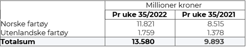 Totalomsetningen hittil i år sammenlignet med tilsvarende periode i fjor framgår av tabell 1. Den økte omsetningen for norske båter er på 3,3 milliarder kroner, fordelt med pluss på 2,2 på fersk- og 1,1 på frystomsetningen. Frystomsetningen pr uke 35 i år er på 4.729 millioner kroner, mens ferskomsetningen er oppe i 7.073 millioner kroner. En stor del av den økte frystomsetningen skriver seg fra sluttspurten i 2021 der kvantumet er omsatt på begynnelsen av 2022. Men økt omsetning av fryst råstoff også i uke 6, da foreløpig ukerekord ble satt med 275 millioner kroner, en rekord som ble slått i uke 12 da med 290 millioner kroner. Omsetningen av fryst torsk pr uke 35 i år er på 2.197 millioner kroner mot 1.346 millioner kroner til samme tid i fjor, av kvantum på henholdsvis 70.890 og 64.950 tonn. Når det gjelder omsetningen av fersklevert råstoff, drar torsken opp pga. økte priser til tross for redusert kvantum. Kvantum fersk torsk omsatt så langt er 193.900 tonn, mot 199.930 tonn til samme tid i fjor, mens verdien er opp fra 3.216 til 4.730 millioner kroner.