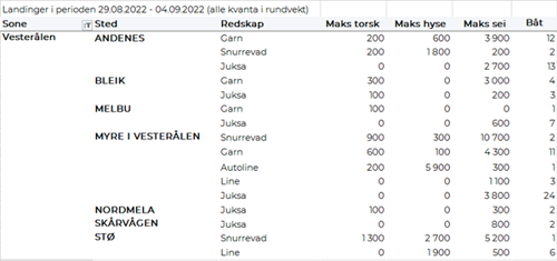 Vi tar også med landinger av fryst råstoff i uke 35 som bare delvis er omsatt. Relativt beskjedne 2.500 tonn ble levert til nøytrale fryselager i uke 35, ned fra 6.940 tonn uken før. I de 2.500 tonnene landet i uke 35 inngår 800 tonn torsk, 790 tonn reke, 525 tonn sei, vel 200 tonn hyse og 130 tonn snabeluer. Det var en båt som stod for rekekvantumet, for øvrig var det landinger fra 6 trålere og 2 snurrevadbåter. Trålerne leverte 580 tonn torsk og 410 tonn sei som de viktigste artene, mens de to snurrevadbåtene hadde 220 tonn torsk, 170 tonn hyse og 115 tonn sei.
