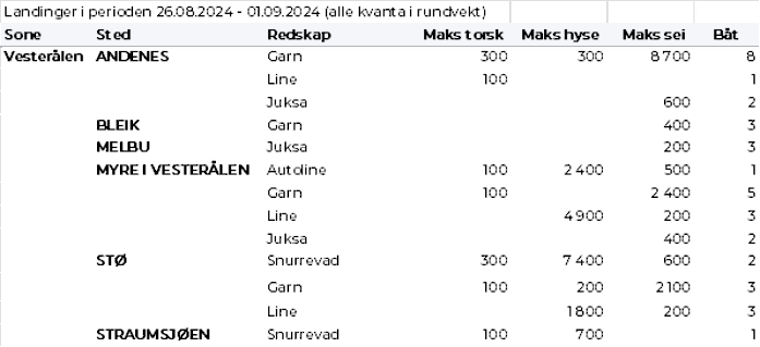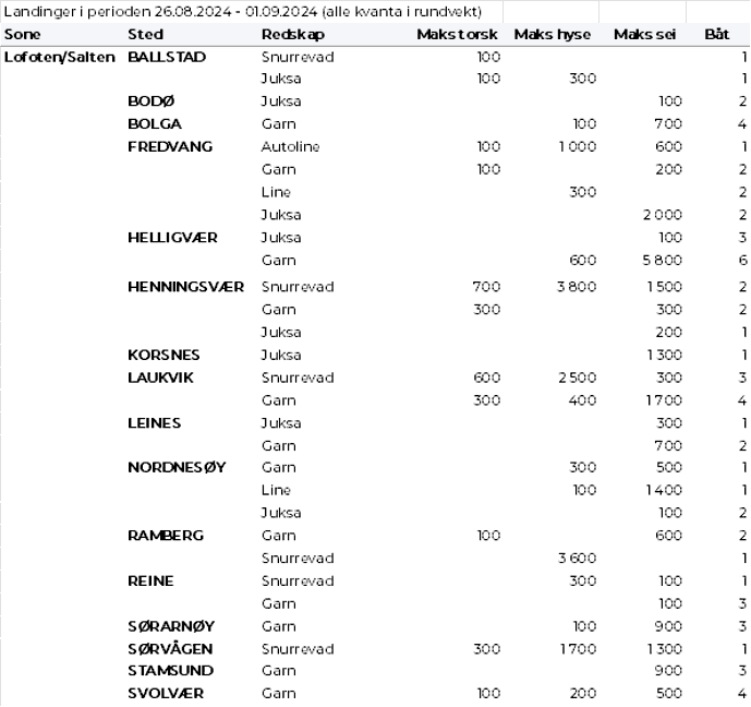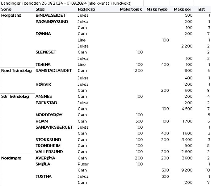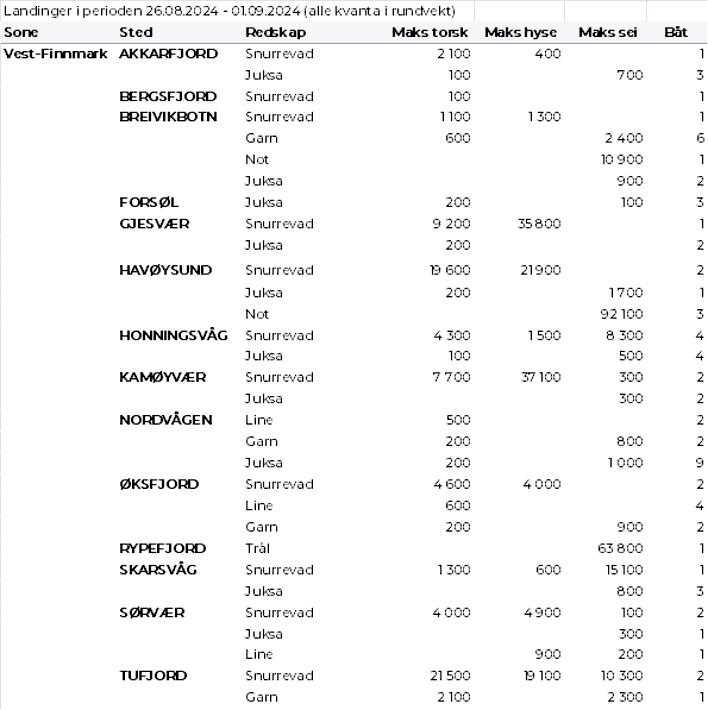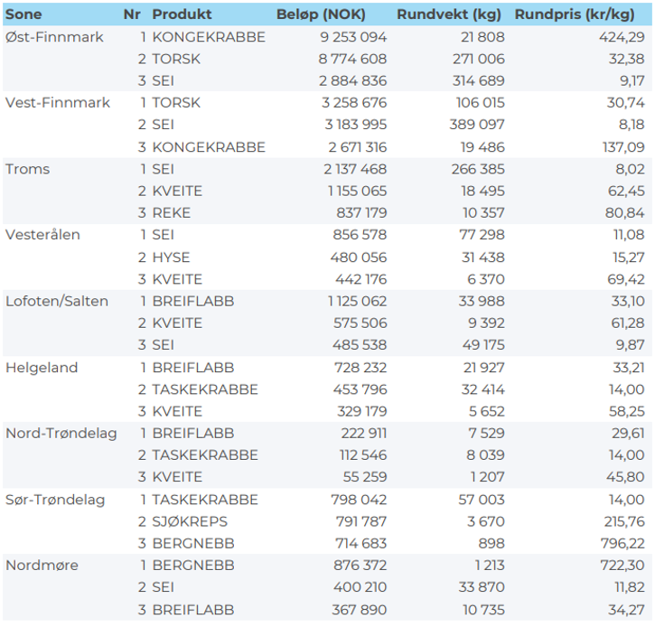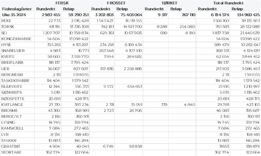Omsetningen av ferskt råstoff i uke 35 utgjorde 59 millioner kroner, ned fra 82 millioner kroner uken før. Fordelt per art er det torsk og kongekrabbe som ligger på topp med nær 13 millioner av totalen, etterfulgt av sei til 11 millioner. Verdier fra 4 millioner og lavere per art for resterende, verdier for alle arter fremgår av tabell 1.