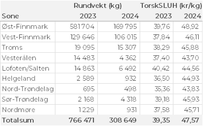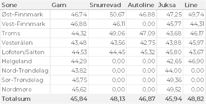 Tabell 2 og 3 viser fordelingen av landingene av fersk torsk pr leveringssone og redskap (unntatt trål), med tilhørende snittpriser. De to tabellene er basert på omsetning av kvalitet A og ekstra, der alle leveringstilstander inngår, men der snittprisene er omregnet til sløyd uten hode-priser, eksklusiv restråstoff.