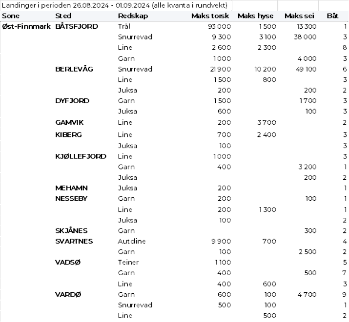 Omsetningen av fersk torsk i uke 35 utgjorde 410 tonn til verdi 13 millioner kroner, ned fra 580 tonn og 19 millioner kroner uka før. 380 tonn levert i Finnmark, av det 270 tonn i øst- og 110 tonn i vestfylket. Fordelt på redskap er 180 tonn tatt på snurrevad, 100 tonn på trål, 70 tonn på line/autoline og 50 tonn på garn.