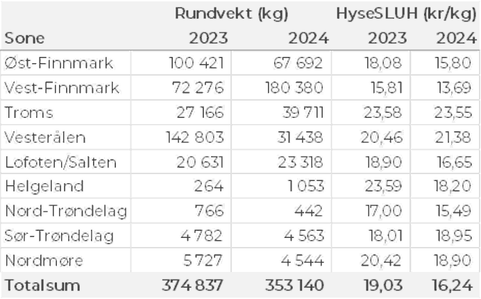 Kvantumet fersklevert hyse i uke 35 var 350 tonn til en verdi av 4,1 millioner kroner, som var ned fra 610 tonn og 6,7 millioner kroner uken før. Snurrevad står for 270 tonn av totalen, etterfulgt av 60 tonn fra line/autoline. Den geografiske fordelingen av hyselandingene framgår av tabell 5.