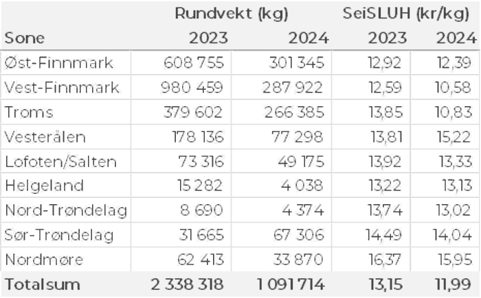 Omsetningen av fersk sei i uke 35 utgjorde 1.210 tonn til en verdi av 11 millioner kroner. Ned fra 1.840 tonn/16 millioner kroner uken før. Fangstene er ganske jevnt fordelt på garn, snurrevad og not med 340-370 tonn på hver, og i tillegg var 110 tonn tatt på trål og 30 tonn på juksa. Fremdeles labert seinotfiske, med leveranser fra 7 båter til 2 kjøpere i Vest-Finnmark og 3 i Troms. Det meste av snurrevadseien var levert i Øst-Finnmark. Mer spredt garnfiske. Den geografiske fordelingen av seileveransene unntatt trål framgår av tabell 4.