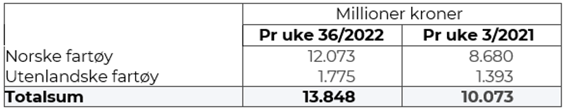 Totalomsetningen hittil i år sammenlignet med tilsvarende periode i fjor framgår av tabell 1. Den økte omsetningen for norske båter er på 3,4 milliarder kroner, fordelt med pluss på 2,3 på fersk- og 1,1 på frystomsetningen. Frystomsetningen pr uke 36 i år er på 4.859 millioner kroner, mens ferskomsetningen er oppe i 7.204 millioner kroner. En stor del av den økte frystomsetningen skriver seg fra sluttspurten i 2021 der kvantumet er omsatt på begynnelsen av 2022. Men økt omsetning av fryst råstoff også i uke 6, da foreløpig ukerekord ble satt med 275 millioner kroner, en rekord som ble slått i uke 12 da med 290 millioner kroner. Omsetningen av fryst torsk pr uke 36 i år er på 2.242 millioner kroner mot 1.375 millioner kroner til samme tid i fjor, av kvantum på henholdsvis 72.250 og 66.210 tonn. Når det gjelder omsetningen av fersklevert råstoff, drar torsken opp pga. økte priser til tross for redusert kvantum. Kvantum fersk torsk omsatt så langt er 194.930 tonn, mot 201.230 tonn til samme tid i fjor, mens verdien er opp fra 3.239 til 4.750 millioner kroner.