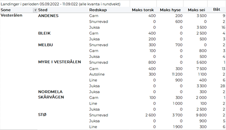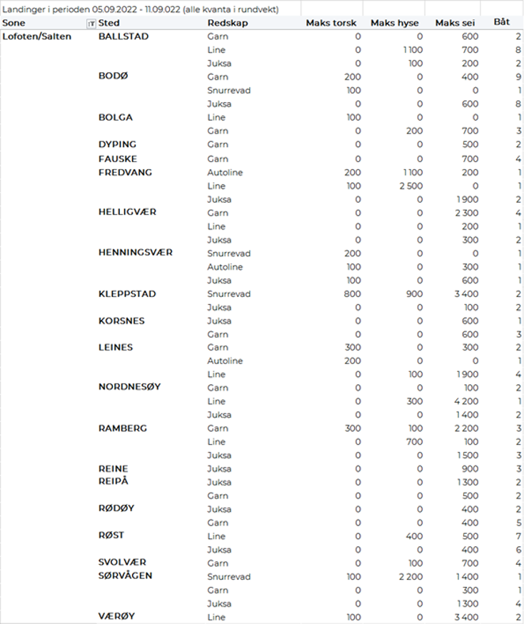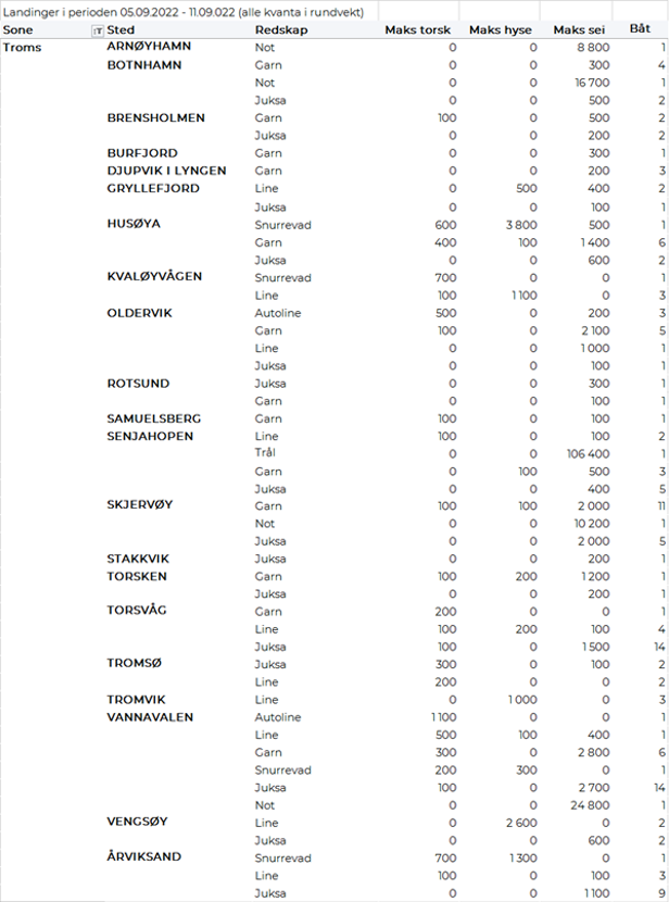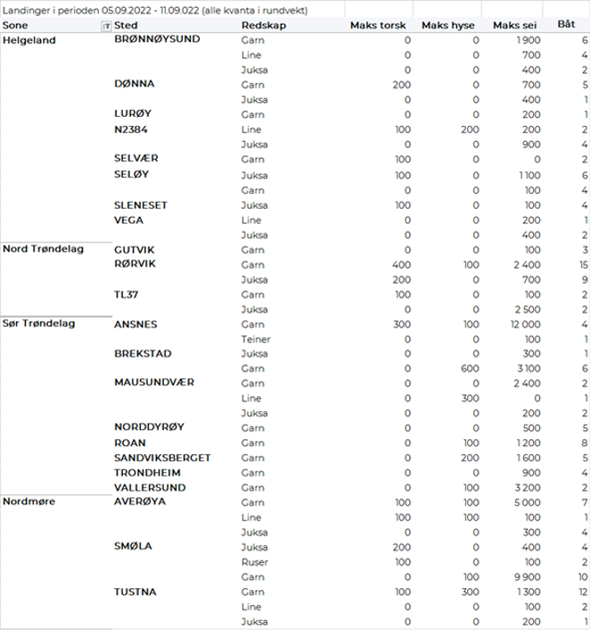 Omsetningen av fersk sei i uke 36 utgjorde 2.300 tonn/24 millioner kroner, mot 1.723 tonn/17,5 millioner kroner uken før. Vest-Finnmark største sone med 918 tonn, hvorav 738 tonn kom fra not. Deretter følger Troms med 417 tonn, hvorav 205 tonn kom fra trål som ble levert i Senjahopen. Utover dette et brukbart juksafiske på Vannøya i Troms med 29 tonn levert til Vannavalen og 20 tonn på Torsvåg. Øst-Finnmark følger deretter med 370 tonn hvorav 280 tonn kom fra snurrevad. Vesterålen står for 312 tonn, hvorav 165 tonn tatt på juksa og 116 tonn på garn. Juksafisket i Vesterålen overgår Troms med 82 tonn levert Myre og 70 tonn levert Andenes, mindre kvanta på resterende steder. 97 tonn er levert Lofoten, der garn står for 35 tonn og juksa 33 tonn. Utover dette tas det også brukbare kvanta i Sør-Trøndelag med 63 tonn og Nordmøre med 78 tonn, det aller meste tatt på garn.