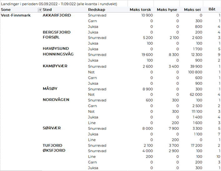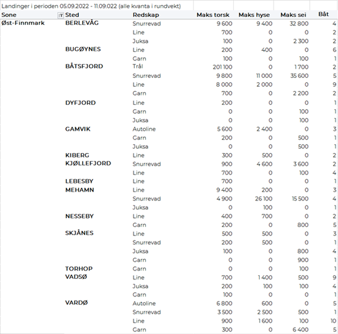 Omsetningen av fersk torsk utgjorde 830 tonn, opp fra 670 tonn uken før. 630 tonn av totalen er levert i Øst-Finnmark der et par trålfangster stod for 375 tonn, snurrevad for 140 tonn og line/autoline for 100 tonn. I Vest-Finnmark var det levert 140 tonn, der nesten alt var tatt på snurrevad. Kvanta under 25 tonn resterende soner.