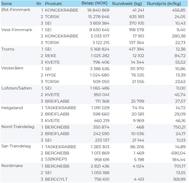 Fisket etter taskekrabbe er inne i sin høysesong, og i forrige uke ble det levert 225 tonn krabbe for 3,2 millioner kroner i området fra Nordland til Trøndelag. Det ble levert mer fersk torsk og sei sammenlignet med uka før, hovedsakelig i Finnmark. For andre uka på rad har det vært beskjedne leveranser av sjøfryst fisk og skalldyr, der reka er størst når det gjelder omsetning.