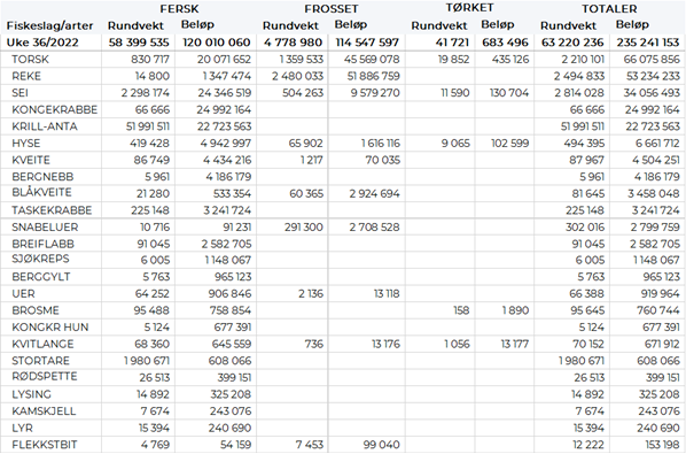 Omsetningen av ferskt råstoff i uke 36 utgjorde 120 millioner kroner, opp fra 94 millioner kroner uka før. Kongekrabbe, sei og torsk var størst i verdi med fra 20 til 25 millioner kroner på hver, og for øvrig slik det framgår av tabell 2.