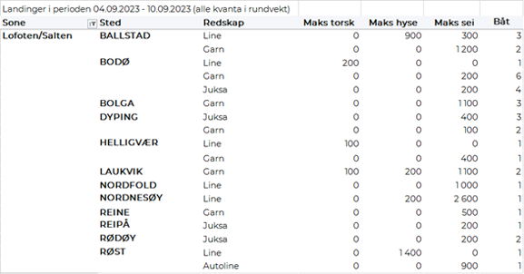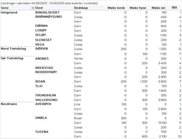 Omsetningen av fersk sei i uke 36 utgjorde 1.500 tonn til en verdi av 14 millioner kroner. En nedgang fra 2.340 tonn/23 millioner kroner i uke 35. Størst kvantum levert i Vest-Finnmark med 850 tonn av totalen, hvorav 670 tonn kom fra not. Deretter følger Øst-Finnmark med 330 tonn av totalen, hvorav 270 tonn ble kom fra snurrevad og 60 tonn fra garn. Deretter følger Troms med 130 tonn, hvorav 100 tonn var tatt på garn. I Vesterålen er det levert 50 tonn, hvorav 40 tonn kom fra garn. I Lofoten er det levert 20 tonn. Lenger sør er det levert 50 tonn på Nordmøre, og tilsvarende i Trøndelag, også der var det meste garnsei.