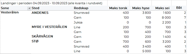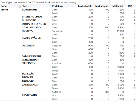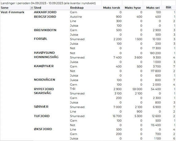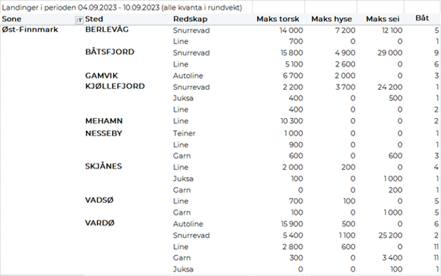 Omsetningen av fersk torsk i uke 36 var på 430 tonn til verdi 11,5 millioner kroner, ned fra 770 tonn/20 millioner kroner uka før. Mest er det levert i Øst-Finnmark som står for 320 tonn av totalen, hvorav 170 tonn var fanget på snurrevad og 130 tonn på line/autoline. Vest-Finnmark følger deretter med 90 tonn av totalen, hvorav 80 tonn kom fra snurrevad. Deretter følger Troms med 10 tonn og kvanta under 5 tonn i resterende soner.