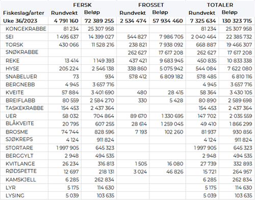 Omsetningen av ferskt råstoff i uke 36 ble på 72 millioner kroner, ned fra 120 millioner kroner uken før. Kongekrabbe var størst i verdi med 25 millioner av totalen, deretter følger sei med 14 millioner, og torsk med 12 millioner. Verdien av øvrige arter fremgår av tabell 2.