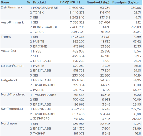 260 tonn snøkrabbe var størst i verdi med 18 millioner kroner, fulgt av 440 tonn reke der førstehåndsverdien var 10 millioner kroner. Videre fulgte 540 tonn sei og 240 tonn torsk, begge verdt 8 millioner kroner, og til sist tar vi med 580 tonn snabeluer der verdien var 7 millioner kroner.