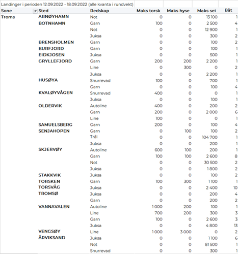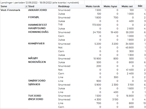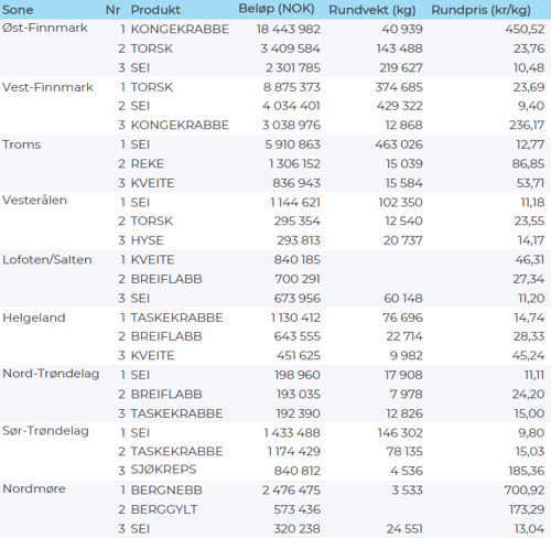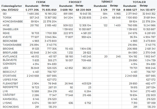 Omsetningen av ferskt råstoff i uke 37 utgjorde 76 millioner kroner, ned fra 120 millioner kroner uka før. Kongekrabbe, sei og torsk var størst i verdi med fra 13 til 22 millioner kroner på hver, og for øvrig slik det framgår av tabell 2.