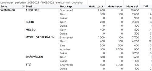 Tabell 2: Omsetning for norske båter i uke 36, 2022, fordelt pr fersk/fryst og pr fiskeslag.