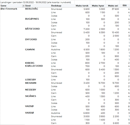 Omsetningen av fersk torsk utgjorde 560 tonn, ned fra 830 tonn uken før. 375 tonn av totalen var levert i Vest-Finnmark, der et par trålfangster utgjorde 260 tonn og for øvrig var 100 tonn tatt på snurrevad. Kvantumet levert Øst-Finnmark ble redusert fra 630 tonn i uke 36 til 140 tonn i uke 37, mest som følge av trålfisk landet i uke 36. Kvantumet i uke 37 kom i hovedsak fra line/autoline med 90 tonn og snurrevad med 40 tonn. Beskjedent med torskelandinger utenom Finnmark.