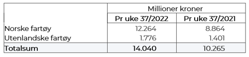 Totalomsetningen hittil i år sammenlignet med tilsvarende periode i fjor framgår av tabell 1. Den økte omsetningen for norske båter er på 3,4 milliarder kroner, fordelt med pluss på 2,3 på fersk- og 1,1 på frystomsetningen. Frystomsetningen pr uke 37 i år er på 4.972 millioner kroner, mens ferskomsetningen er oppe i 7.280 millioner kroner. En stor del av den økte frystomsetningen skriver seg fra sluttspurten i 2021 der kvantumet er omsatt på begynnelsen av 2022. Men økt omsetning av fryst råstoff også i uke 6, da foreløpig ukerekord ble satt med 275 millioner kroner, en rekord som ble slått i uke 12 da med 290 millioner kroner. Omsetningen av fryst torsk pr uke 37 i år er på 2.265 millioner kroner mot 1.386 millioner kroner til samme tid i fjor, av kvantum på henholdsvis 72.910 og 66.710 tonn. Når det gjelder omsetningen av fersklevert råstoff, drar torsken opp pga. økte priser til tross for redusert kvantum. Kvantum fersk torsk omsatt så langt er 195.280 tonn, mot 202.300 tonn til samme tid i fjor, mens verdien er opp fra 3.259 til 4.764 millioner kroner.