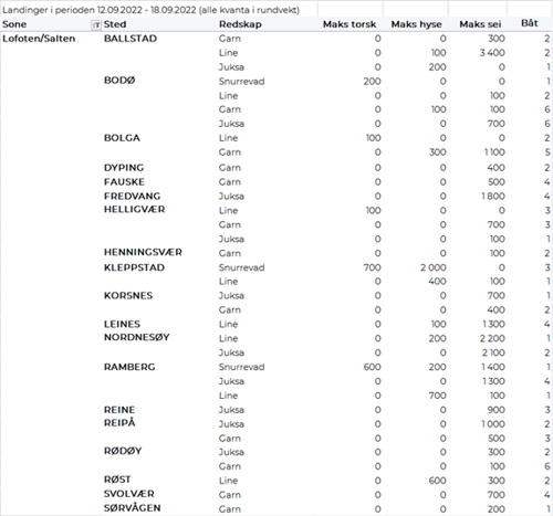 Mange store og små båter ble værhindret i forrige uke og måtte holde seg til kai. Dette førte til en kraftig reduksjon i leveranser av villfanget fisk og skalldyr sammenlignet med uken før - med unntak for taskekrabbe, der båtene fra Helgeland og sørover holdt uforandret aktivitetsnivå.