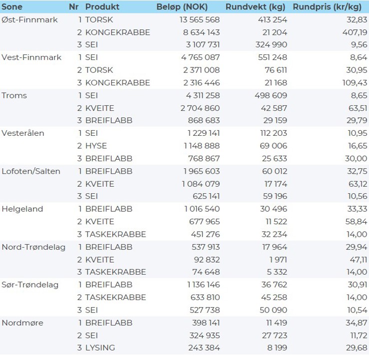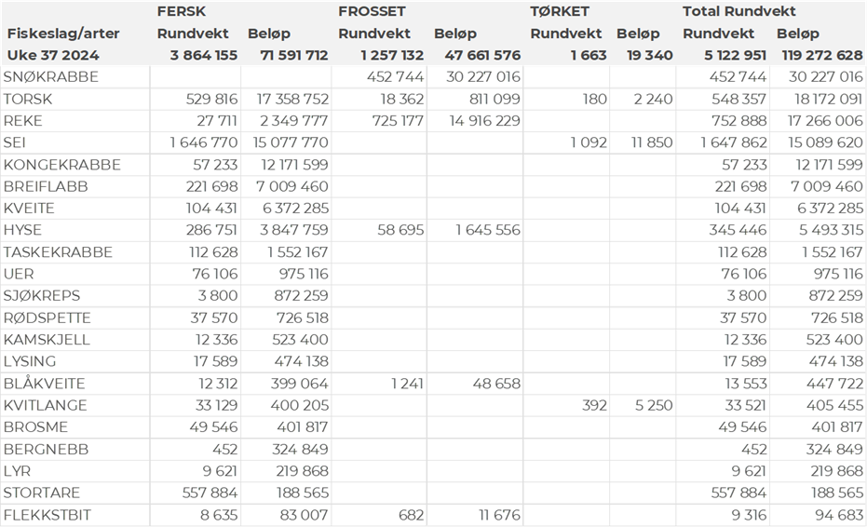 Omsetningen av ferskt råstoff i uke 37 utgjorde 71 millioner kroner, opp fra 64 millioner kroner uken før. Fordelt per art er det torsk, sei, kongekrabbe, breiflabb og kveite som står for det meste, jf. tabell 1.