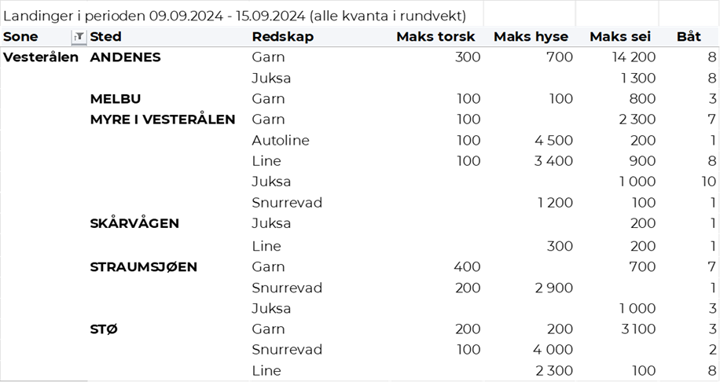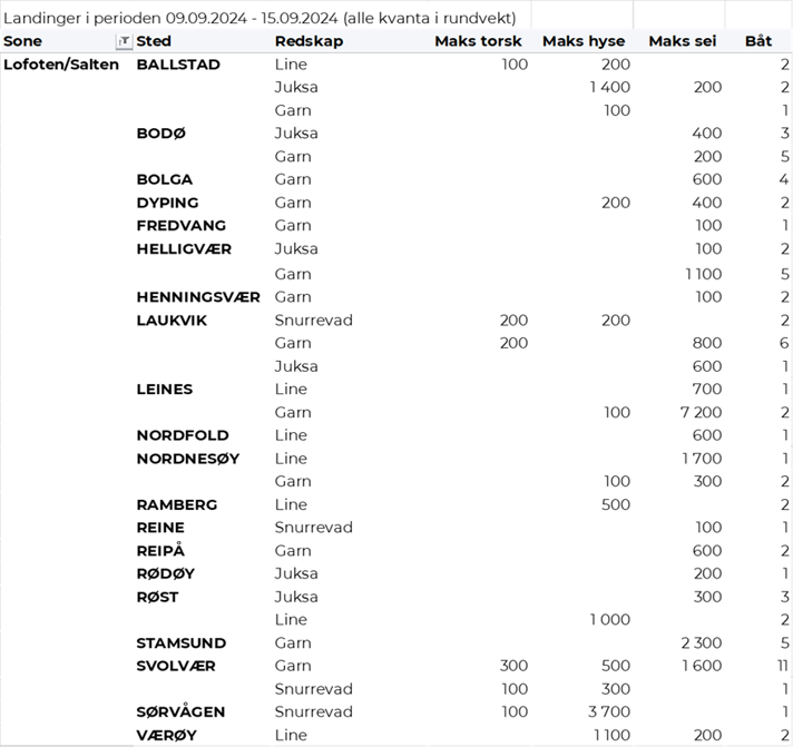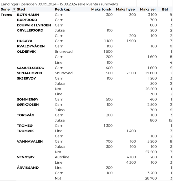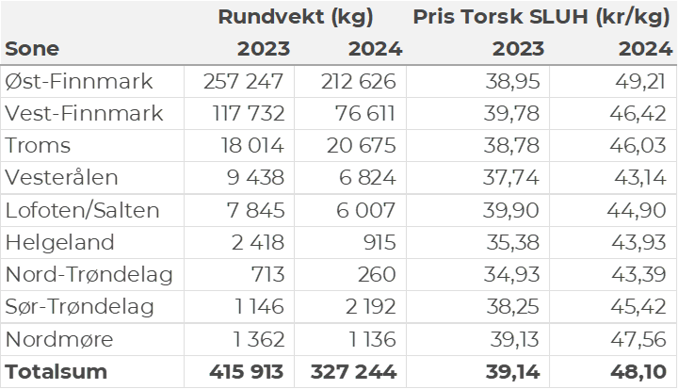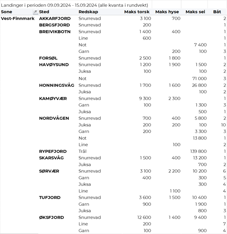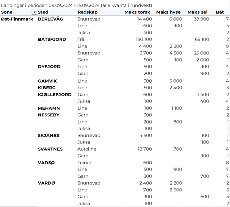 Omsetningen av fersk torsk i uke 37 utgjorde 530 tonn til verdi 17 millioner kroner, opp fra 300 tonn og 10 millioner kroner uka før. 490 tonn levert i Finnmark, av det 410 tonn i østfylket. Fordelt på redskap er nær 200 tonn tatt på trål, 170 tonn på snurrevad, 110 tonn på line/autoline og 40 tonn på garn.