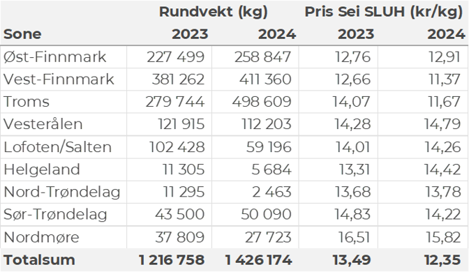 Omsetningen av fersk sei i uke 37 utgjorde 1.650 tonn til en verdi av 15 millioner kroner. Opp fra 1.380 tonn/12 millioner kroner uken før. 590 tonn var tatt på not, 430 tonn på snurrevad, 350 tonn på garn, 200 tonn på trål og 50 tonn på juksa. Seinotfiske ga leveranser fra 10 båter til 3 kjøpere i Vest-Finnmark og 3 i Troms. Det meste av snurrevadseien var levert i Øst-Finnmark. Mer spredt garnfiske. Den geografiske fordelingen av seileveransene unntatt trål framgår av tabell 4.
