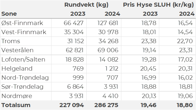 Kvantumet fersklevert hyse i uke 37 var 289 tonn til en verdi av 3,8 millioner kroner. En økning fra 240 tonn/ 3,0 millioner kroner uken før. Størst kvantum er tatt på line/autoline med 158 tonn av totalen, etterfulgt av snurrevad med 102 tonn. Det meste av hysa leveres i Øst-Finnmark som står for 128 tonn av totalen, etterfulgt av Vesterålen med 69 tonn, 34 tonn i Troms og 31 tonn i Vest-Finnmark. Kvanta fra 1-15 tonn i resterende soner.