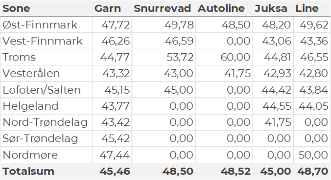 Tabell 2 og 3 viser fordelingen av landingene av fersk torsk pr leveringssone og redskap (unntatt trål), med tilhørende snittpriser. De to tabellene er basert på omsetning av kvalitet A og ekstra, der alle leveringstilstander inngår, men der snittprisene er omregnet til sløyd uten hode-priser, eksklusiv restråstoff.