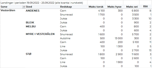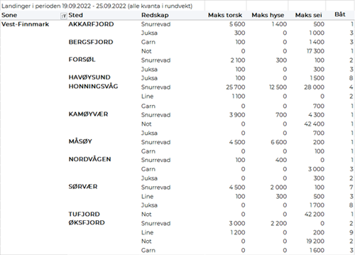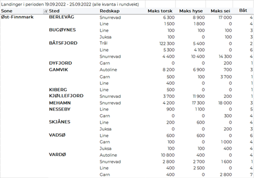 Omsetningen av fersk torsk utgjorde 560 tonn, på samme nivå som uken før. 220 tonn var tatt på snurrevad, 210 tonn på trål og 100 tonn på line/autoline. 370 tonn av totalen var levert i Øst-Finnmark, deriblant fra to trålere som stod for de 210 tonnene tråltorsk fisket på Thor Iversen. Landingene i Øst-Finnmark bestod for øvrig av 90 tonn tatt på lina og 70 tonn på snurrevad. Utenom Øst-Finnmark var 130 tonn levert i Vest-Finnmark, i all hovedsak fisket på snurrevad.