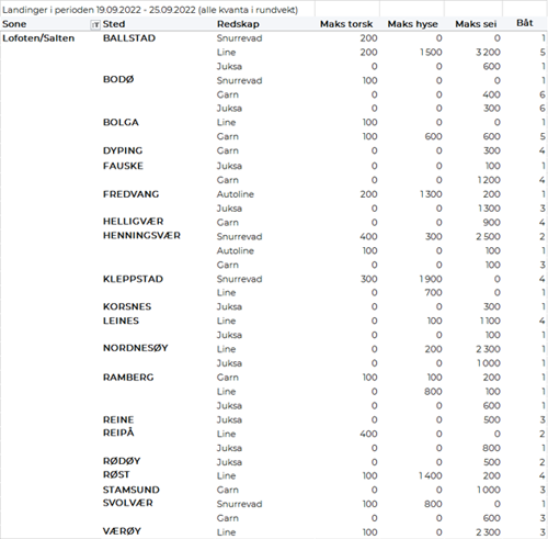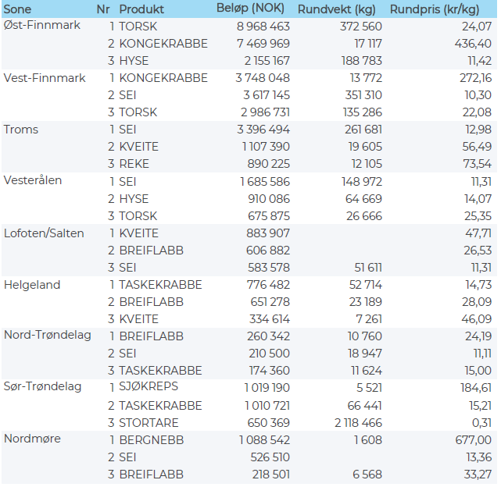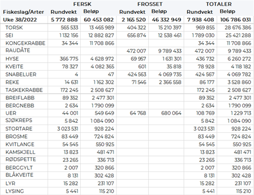 Omsetningen av ferskt råstoff i uke 38 utgjorde 60 millioner kroner, ned fra 77 millioner kroner uka før. Torsk, sei og kongekrabbe var størst i verdi med 12-13 millioner kroner på hver, og for øvrig slik det framgår av tabell 2.