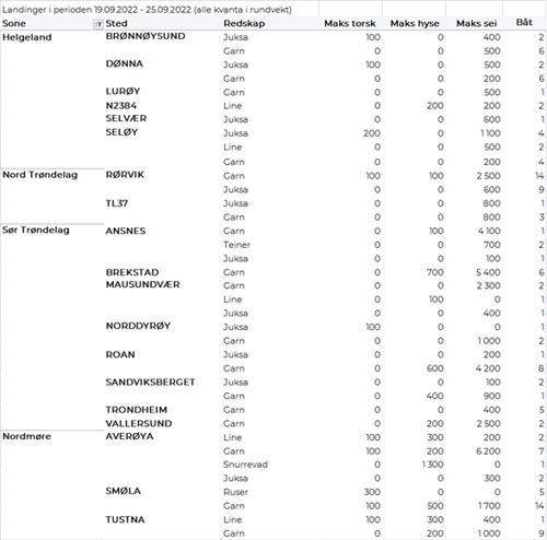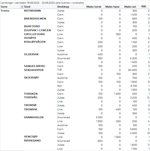 Omsetningen av fersk sei i uke 38 utgjorde 1.130 tonn/13 millioner kroner, mot 1.480 tonn/16 millioner kroner uken før. Vest-Finnmark og Troms var størst i kvantum med henholdsvis 350 og 290 tonn, deretter følger Øst-Finnmark med 170 tonn, Vesterålen med 150 tonn, Lofoten/Salten og Sør-Trøndelag med 50 tonn på hver, 40 tonn på Nordmøre og 20 tonn i Nord-Trøndelag. Redskapsfordelingen var 300 tonn på hver av snurrevad og garn, 190 tonn på not og 170 tonn på juksa. Snurrevadkvantumet fordelt med 130 tonn levert Øst-Finnmark, 120 tonn i Øst-Finnmark og 40 tonn i Vesterålen. Garnkvantumet var spredt. Det meste av notkvantumet var levert i Vest-Finnmark, mens på juksa var det meste levert i Troms og Vesterålen.
