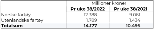 Totalomsetningen hittil i år sammenlignet med tilsvarende periode i fjor framgår av tabell 1. Den økte omsetningen for norske båter er på 3,3 milliarder kroner, fordelt med pluss på 2,3 på fersk- og 1,0 på frystomsetningen. Frystomsetningen pr uke 38 i år er på 5.035 millioner kroner, mens ferskomsetningen er oppe i 7.342 millioner kroner. En stor del av den økte frystomsetningen skriver seg fra sluttspurten i 2021 der kvantumet er omsatt på begynnelsen av 2022. Men økt omsetning av fryst råstoff også i uke 6, da foreløpig ukerekord ble satt med 275 millioner kroner, en rekord som ble slått i uke 12 da med 290 millioner kroner. Omsetningen av fryst torsk pr uke 38 i år er på 2.292 millioner kroner mot 1.416 millioner kroner til samme tid i fjor, av kvantum på henholdsvis 73.670 og 68.060 tonn. Når det gjelder omsetningen av fersklevert råstoff, drar torsken opp pga. økte priser til tross for redusert kvantum. Kvantum fersk torsk omsatt så langt er 195.860 tonn, mot 203.100 tonn til samme tid i fjor, mens verdien er opp fra 3.275 til 4.778 millioner kroner.