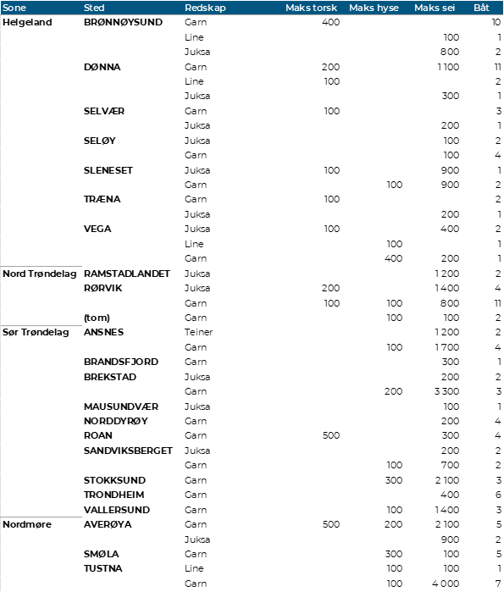 Tabell 2 og 3 viser fordelingen av landingene av fersk torsk per leveringssone og redskap (unntatt trål), med tilhørende snittpriser. De to tabellene er basert på omsetning av kvalitet A og ekstra, der alle leveringstilstander inngår, men der snittprisene er omregnet til sløyd uten hode-priser, eksklusivt restråstoff.