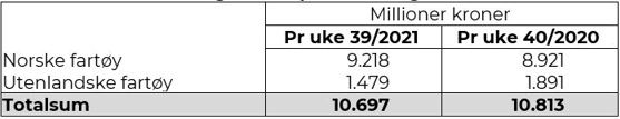 Tilsvarende uke i fjor, som var uke 40 (28. september – 4. oktober 2020) var omsetninga 176 millioner kroner, hvorav 18 millioner kroner kom etter landing fra utenlandske båter. Omsetningen for norske båter var 158 millioner kroner, fordelt med 67 på fersk og 91 på fryst.