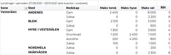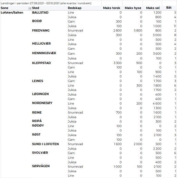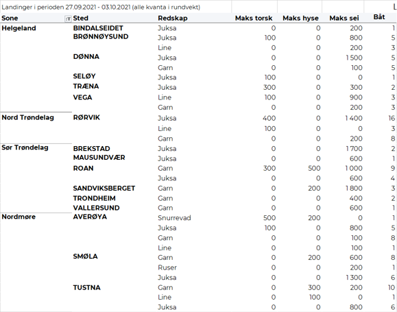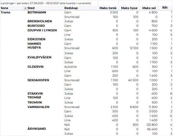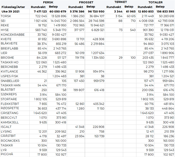 Omsetningen av fersk torsk i uke 39 utgjorde 720 tonn til verdi 13,5 millioner kroner, mot 800 tonn til verdi 15,5 millioner kroner uka før. Av kvantumet i uke 39 var 310 tonn tatt på snurrevad, 290 tonn på line/autoline, 50 tonn på trål, 40 tonn på garn og 30 tonn på juksa. Line/autoline økte sitt kvantum med 100 tonn sammenlignet med uka før, uendret for snurrevad, mens trålkvantumet ble redusert fra 250 tonn uka før. 260 tonn av de 290 tonnene tatt på line/autoline var levert i Øst-Finnmark. Av snurrevadkvantumet på 310 tonn var 180 tonn levert i Vest-Finnmark, 90 tonn i Øst-Finnmark og 20 tonn i Lofoten/Salten.